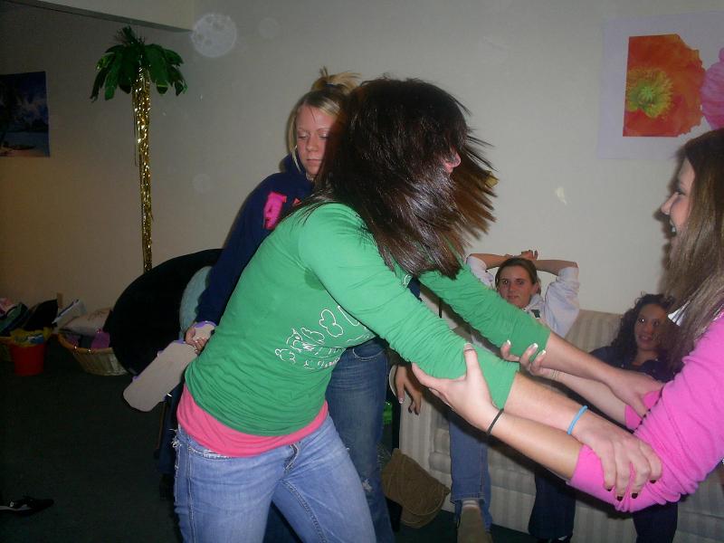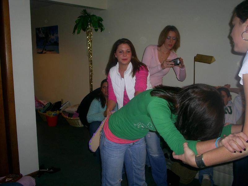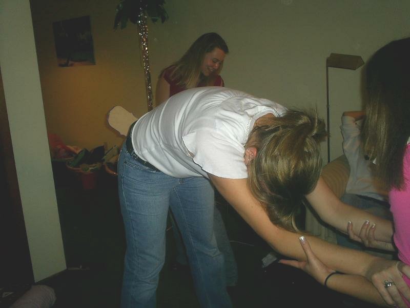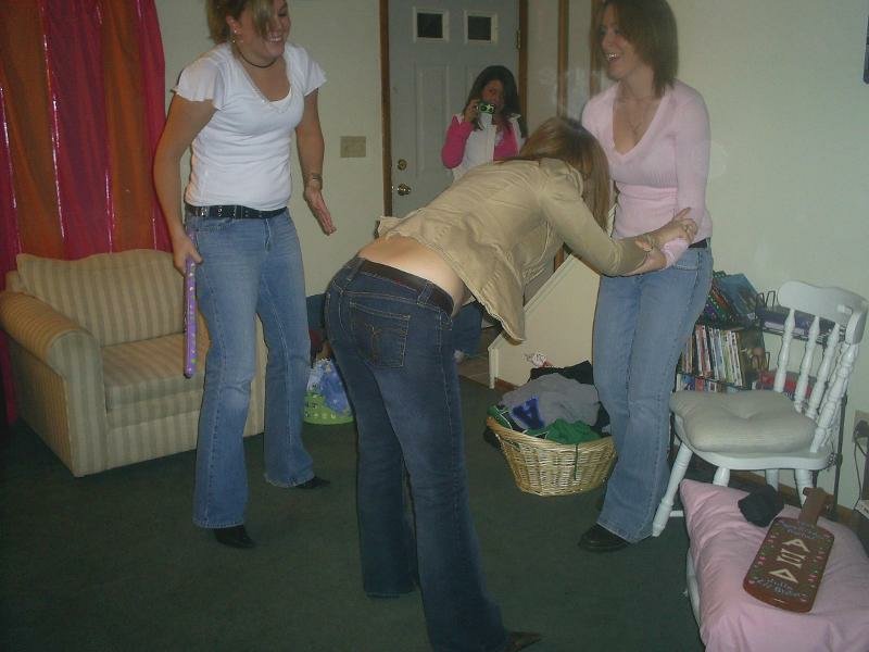 Many of the sorority paddling pictures I have posted come from the cermony in which the “Little Sister” gives her “Big Sister” the paddle she has made for her. Traditionally, a single swat is exchanged between the two sorority sisters and nothing more. But in some cases, in which we may never actually know more than we see in the pictures, some girls are paddled by several different members of the sorority. This sequence is nice for a few different reasons. First, I really like the fact that one girl holds the other in place during the paddling. The second feature is that it appears that the girl with the green shirt, is paddled by every girl that is visible in all of the pictures in the set. Was she just a pledge that found herself in trouble? Maybe she just likes to be paddled? I guess we will never know. Click the “MORE” link for the entire set of paddling pictures.